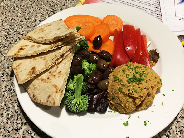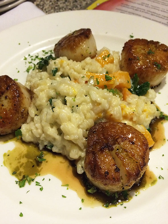 How fortunate for me then that at the end of a long intense day of writing, I could enjoy a stellar three course meal. My son joined me at the Sunrise Cafe where I ordered the Hummus Plate, Scallops with Risotto, and the Apple Strudel. He preferred my creamy kale and squash studded risotto to his own standard Mac and Cheese. I only got a first bite of the crispy strudel before he seized the heavenly “pie” for himself.