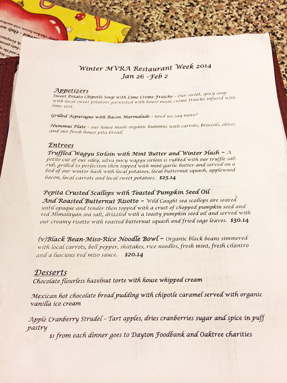 Casting about for a new annual ritual, I was pleasantly surprised by the advent of Winter Restaurant Week 26 January – 6 February sponsored by the Miami Valley Restaurant Association. I had a technical paper due this past Friday at 5pm and, as a consequence, skipped lunch every single day in order to make sure I put everything I possibly could—my life’s work and passion—into 11 pages.