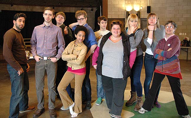 The cast and crew of GODZILLA!, an original musical parody written by Yellow Springs native Corrie Van Ausdal, rehearsed last weekend at the Glen Helen Auditorium. The show, produced by YSKP, opens in the auditorium on Friday, Feb. 8, at 7 p.m. and continues Feb. 9 at 3 p.m. and on the following weekend, Friday, Feb. 14, at 7 p.m. and Saturday, Feb. 15, with performances at 7 and 10 p.m. From left are musical director Xavier Suarez, actors Blaize Wright, Bear Wright, Sumayah Chappelle, Duard Headley and Jeremiah Scott, stage manager Amy Cunningham, writer/director Van Ausdal, assistant director Hannah Craig and choreographer Jill Becker. (Photo by Megan Bachman)