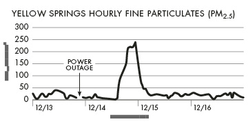 On Dec. 14, measures of the pollutant PM2.5 departed from a normal local level of 10 μg/m3 starting at around 3 p.m. and lasted for 12 hours. Yellow Springs’ 24-hour average of 71.7 μg/m3 triggered the rare EPA air quality index designation “Unhealthy,” which is the fourth highest after “Good,” “Moderate,” and “Unhealthy for Sensitive Groups,” according to RAPCA air pollution analyst Andy Roth. Only “Very Unhealthy” and “Hazardous” are higher.