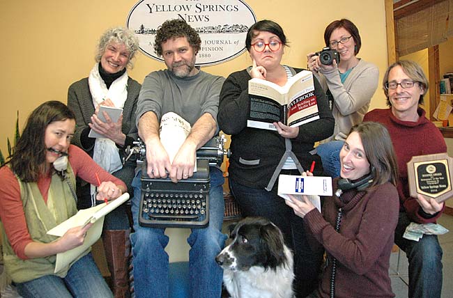The Yellow Springs News recently won the top prize in its size category at the annual convention of the Ohio Newspaper Association. Shown above are fulltime staff members, from bottom left clockwise: Lauren Heaton, Diane Chiddister, Matt Minde, Lauren Shows, Suzanne Szwmpruch, Bob Hasek, Megan Bachman and Tucker the Newshound.