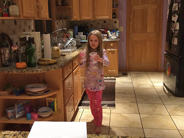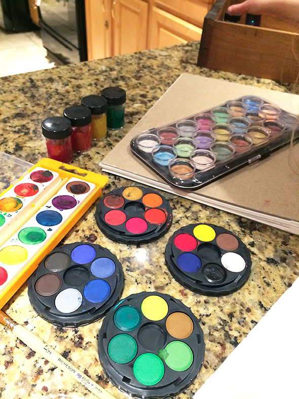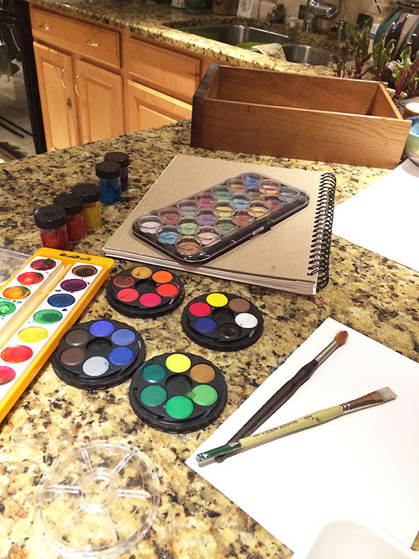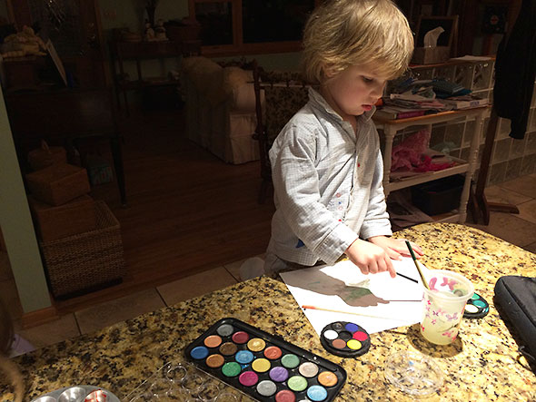 With authority, she set about the business. She climbed up on the kitchen counter at the sink and filled two cups with clear water. She set one cup before me and the other at her stool. Next, she offered me a choice of paint brushes and asked after the watercolor paints. I pointed her in the direction of her work desk, and she returned directly with its top right-hand drawer.