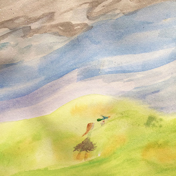 With a final consultation on how much water to use, we began to paint. Holding our brushes like pencils, we each sketched out a landscape. Mine was a rolling meadow with silver-lined clouds overhead. Hers was a rainbow-formed archway under which two figures walked. She teases me into guessing their identity, offering clues, and daring me not to recognize my own image. As my hillside took shape, she pointed the location where she wanted to run and slid the pearly paint set closer that I might take her kind suggestion.