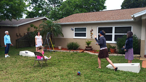 Code-named “Tennis Camp”, the trip was committed to by all parties—including our hosts fortunately—and my sisters and I packed our swimsuits and sandals immediately…a mere seven weeks out. Just as the cold weather finally broke free of the two-coat temperatures gripping the north, Spring Break arrived and sent us south. This weekend found me in short sleeves and open-toe shoes playing cornhole in the front yard of my dad’s home in Seminole FL.
