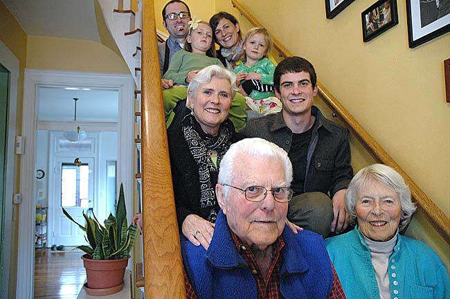 Wally and Evelyn Sikes, foreground, moved to Yellow Springs in the 1950s to live and work in the community. Their children and grandchildren grew up in the village, and though the third generation has returned to raise their own children here, finding local jobs is not as easy as it once was. Pictured behind the elder couple are Linda Sikes and her son Kevin Sikes-Gilbert, as well as her daughter Naomi and son-in-law Chris Bongorno with their children, from left, Nora and Elise. (Photo by Megan Bachman)