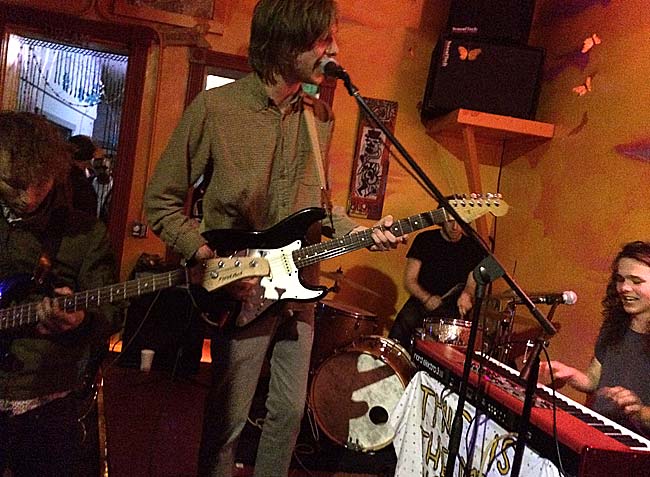 Local indie band Speaking Suns rocked the audience at the Spirited Goat Coffeehouse on Saturday night. The band will perform with labelmates Sport Fishing USA and Blond at a fundraiser for the independent label Great Guys Records. From left are Connor Stratton on bass, Jacob Diebold on guitar, David Byrne (back) on drums and Sam Salazar on keyboard. (Photo by Megan Bachman)