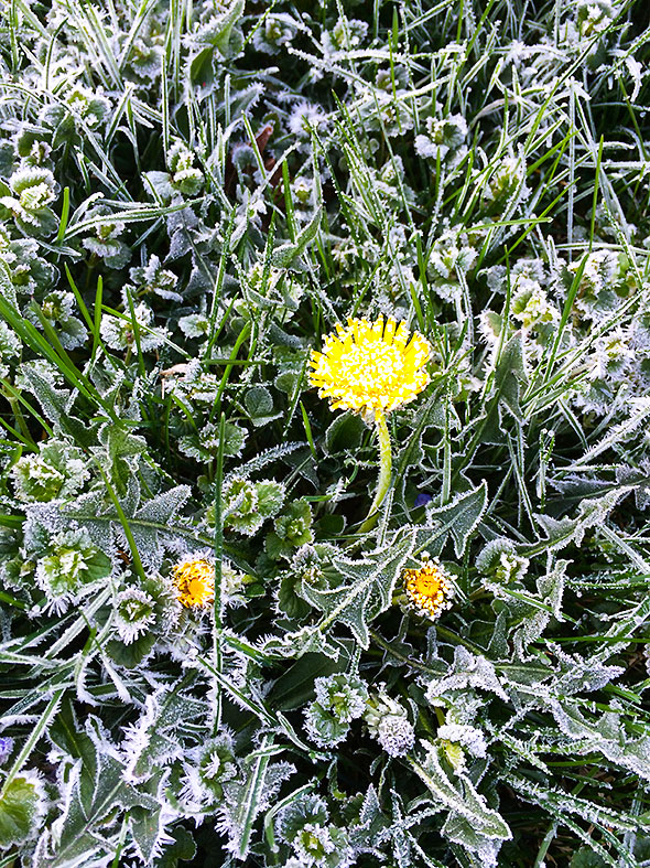 These building crescendos of blooms are most fortunate in their timing. The pear trees along Xenia Avenue and Orton Road—that were so magnificently ornate in pink and white silk petals on Monday—now sport darkened husks prematurely spent after being covered by an early Tuesday morning snow and painted by a hard frost on Wednesday.