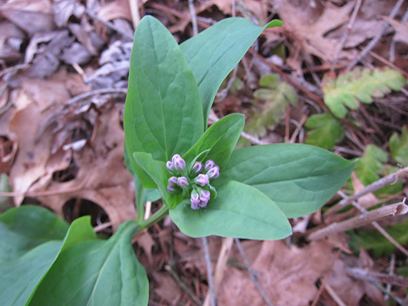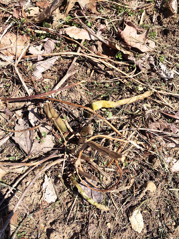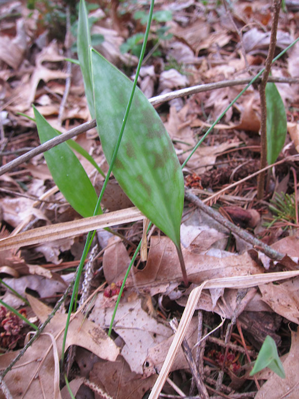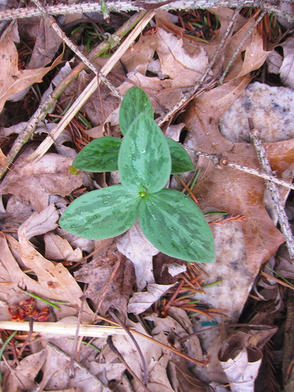 The native wildflowers nestled in my herb garden seem to have faired better in a sheltered microclimate between our house and and the neighbors’. The trillium appear slightly stunted and tender compared to its predecessors of the past two years, but the symmetry of its triple leaf pattern is undisturbed and free of defect. Several shoots of trout lily have pierced through the thick layer of mulch comprised of pine needles, maple and oak leaf.