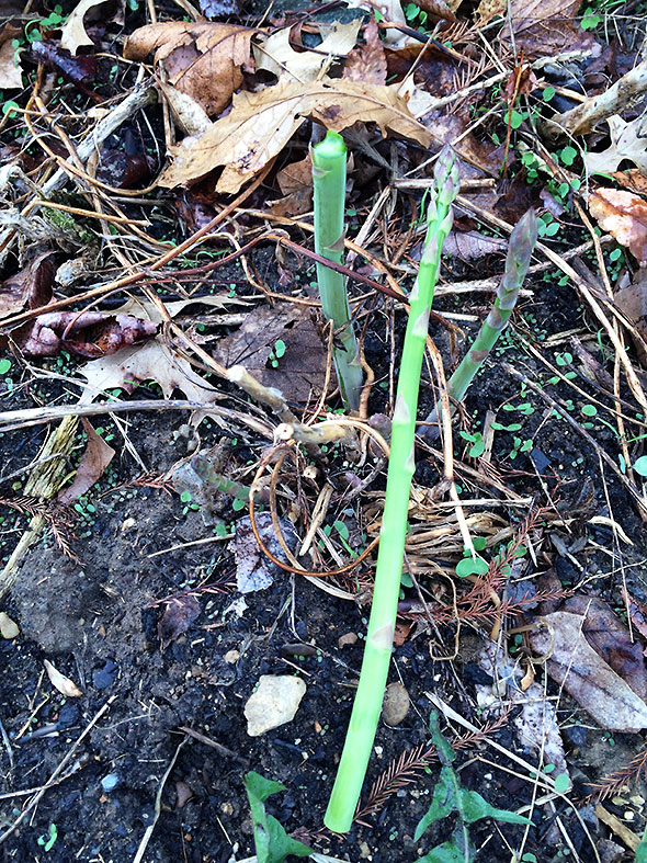 When I left the garden on Monday, there was still several hours of daylight ahead and I thought to leave the remaining asparagus shoots a few last minutes of sun. Unfortunately, I did not make it back to rescue them from the frost. When I plucked them from the ground this morning—frost bit and wilted—I was surprised to find their bases still snappy green and apparently growing. Curious about how far gone the asparagus might be, I bit into them myself. The damaged stalks proved entirely edible and surprisingly tasty, and I was happy that I hadn’t completely abandoned them.