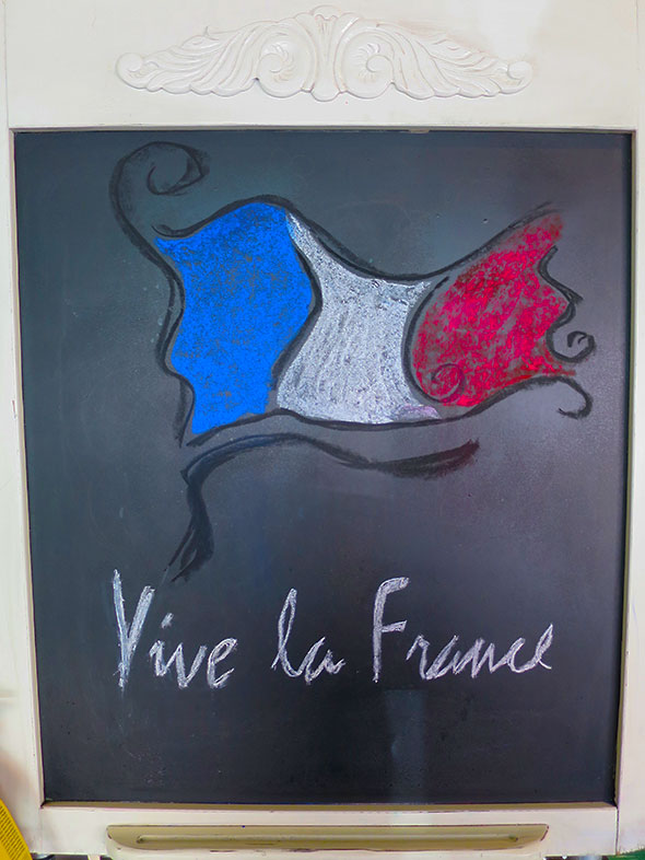 Returning to the checkout counter, I did treat myself to one small pastry: a chocolate macaroon. Its delicate sandwich crust and creamy filling ended my afternoon repast on a sweet, satisfying note. I returned outside to my walk to find signs of another local enjoying a Paris-Spring day. A bike stood balanced against the front window at the Emporium. Beside it, a large baguette wrapped in a soft cover book lay poised on the window sill. I smiled to see further evidence of how blessed we are: to live in village as art-garden, good-bread, fine-food rich as I would ever hope to find among the elegant districts of Paris.