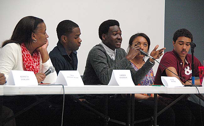 Current and former Yellow Springs High School students spoke about racism in the local schools and how to empower local black youth at a panel discussion April 21 at AU Midwest. Panelists are, from left, Teresa Bondurant-Wagner, Cameron Henderson, Hafiz Mensah, Taylor Beck and Edward Johnson. (photos by Megan Bachman)
