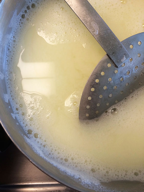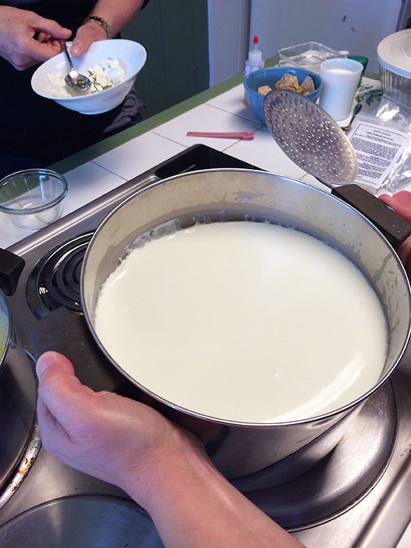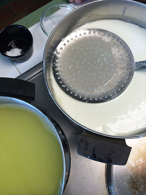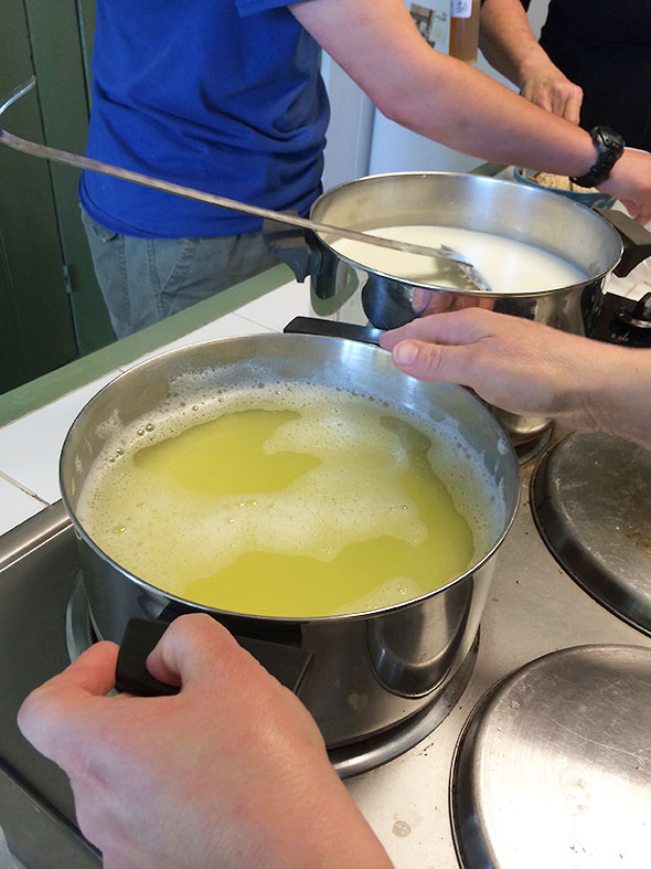 After our success with the mozzarella, we started a batch of ricotta. A first attempt at making ricotta had failed before I arrived. The failure was attributed to the whey that was used in the recipe. It had aged a week, and most recipes recommend a whey that is at most three days old. Now, after making a batch of mozzarella, we had fresh whey and enough dairy to try again.