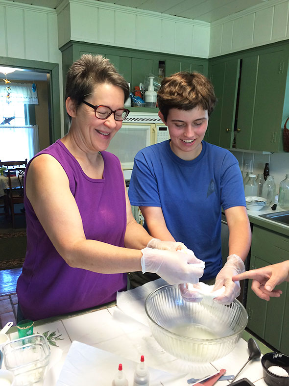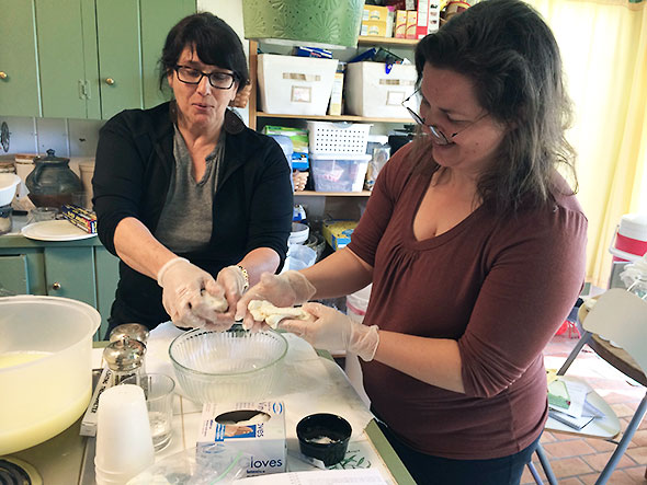 Under Caroline’s watchful eye, we all took a turn working the mozzarella into form. We followed Keegan’s lead as he has a practiced hand. A good mozzarella is balanced its moisture content, Keegan told us. He warned, “Don’t overwork the cheese and squeeze too hard, or you’ll wind up with a hockey puck instead of cheese.”