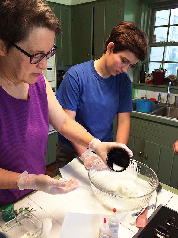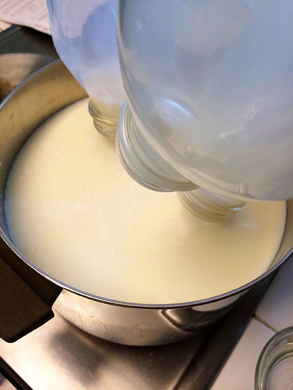 Next, we made mozzarella. Our recipe called for a gallon of milk, 5/4 teaspoon of citric acid powder, a 1/4 teaspoon of liquid rennet, and half a cup of cold water. Straight from the goats, our milk was not homogenized. As we poured the milk into a stock pot, Keegan and I could see swirls of dense milk fat form on top. We held the bottles above the pot for a minute to let the clinging fats drip downward and out.