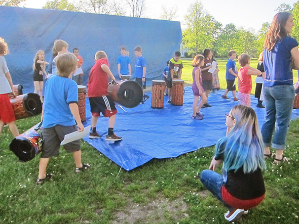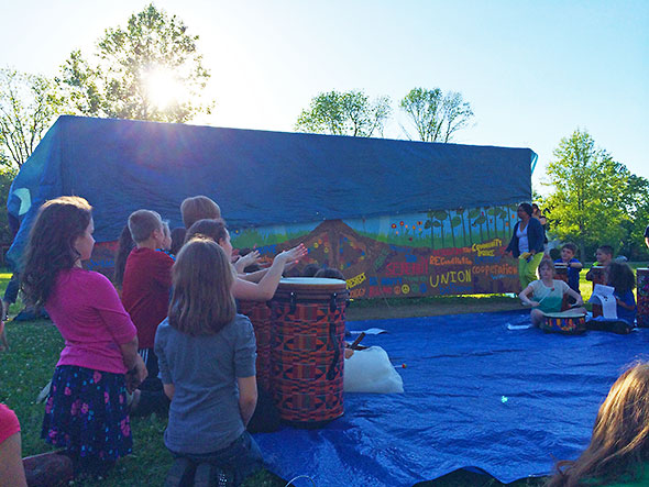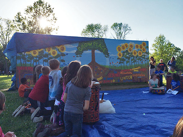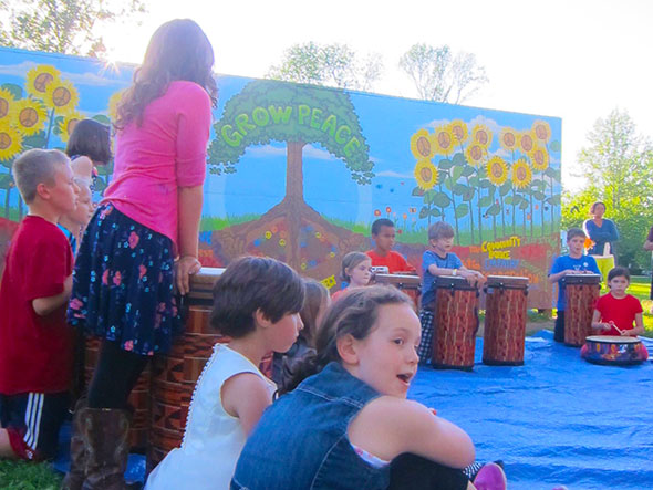 On the west lawn of the school, another drama unfolded Friday night as the hard work of the third and sixth grade students came to a thrilling climax. Since March, the sixth grade class has been developing a peace mural for the east-facing kickball wall. Friday was the mural’s unveiling. As the sun set behind a makeshift stage of bright blue tarp, the third grade class set up a colorful assortment of conga drums before the cloaked mural and waited with anticipation.