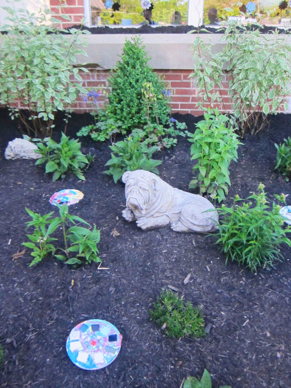 That afternoon and evening, the children received many more visitors and treated each to stories of the front garden’s evolution. The garden and its young attendants were charming and drew a steady stream of sightseers. In the maze of entwining tours, my daughter played the role of docent well. Confidently guiding her guests around the garden, she walked through how—step by step, layer by layer—the flowerbed was rebuilt. Taking advantage of the posted teaching materials and reading the many sentences with ease, my first grader described nagging problems that the design resolved. Weaving her own experience among the special points of interest, she pointed out the stone bulldog sitting boldly in the midst of the flowers and—surprise!—the twinkling glass ornaments peaking out from the dark-red foliage of the Japanese maple. She took her audience into confidence and revealed a few of the garden’s flaws but plainly stood as its unfading advocate.