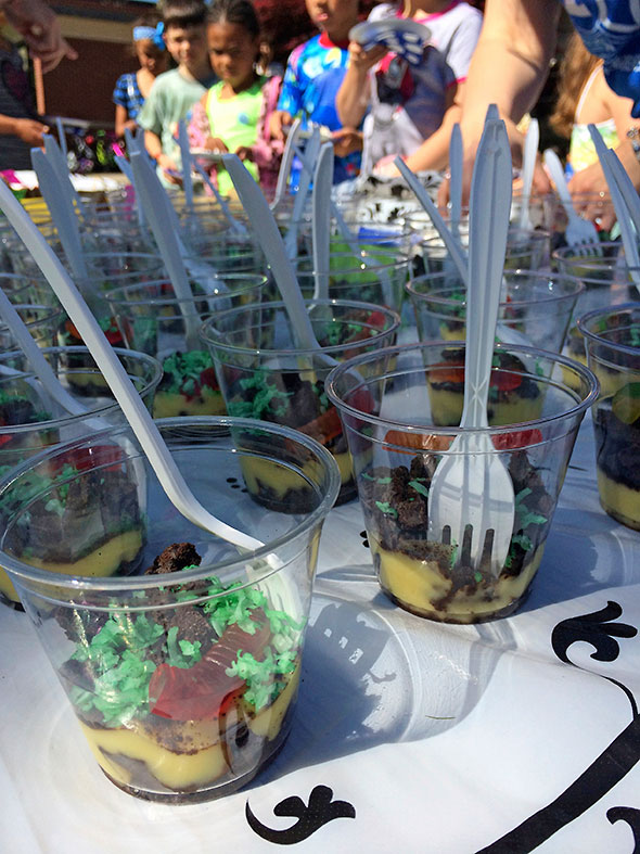 Led by Ms Simms, the children greeted their visitors with the school song…”Mills Lawn is like a red-brick garden”…and then together we ate dirt. A concoction made of cookies and pudding and spun with gummy worms, our mid-morning treat was served in clear cups so we could appreciate its interesting, evocative layer of elements.