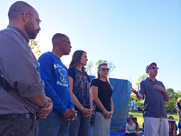 Mills Lawn Principal Matt Housh, Guidance Counselor John Gudgel, and Art Teacher Amy Minehart stood up with Visiting Artist Tricia Tallman. Artist Tallman mentored the sixth graders through the mural’s creation which included brainstorming themes based on colors, images, and themes that conveyed the roots and fruits of peace. When the time came for the reveal, a mighty drum roll sounded as the tarp veil was lifted over the kickball wall. Silhouetted by a rainbow-hued glory from the setting sun, the mural presented a tall, straight tree anchored in rich soil surrounded by a field of flourishing sunflowers. The tree’s canopy reads “Grow Peace”, and the ground from which it vaults is layered in the overarching themes and attributes of a peaceable people: tolerance, resolution, patience, honesty, fearlessness, reconciliation, gratitude, caring, diversity, harmony, and courage.