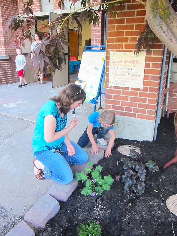 Friday morning at 10am, I answered a special invitation given to helpers on the First Graders’ Beautiful Spaces project. I had helped out midpoint in the project…after weeds had been pulled but before the new plants were set in place. I was curious as to how the landscaping turned out. I was also a little apprehensive for the childrens’ sake. Wednesday night had delivered torrential rains to the area. Flash floods spilled into roads, lawns, and basements forcefully redecorating as churning water pressed from high land to low. Evanescent but mighty creeks conducted several village gardens—newly sown on Mother’s Day—to heaven knows where.