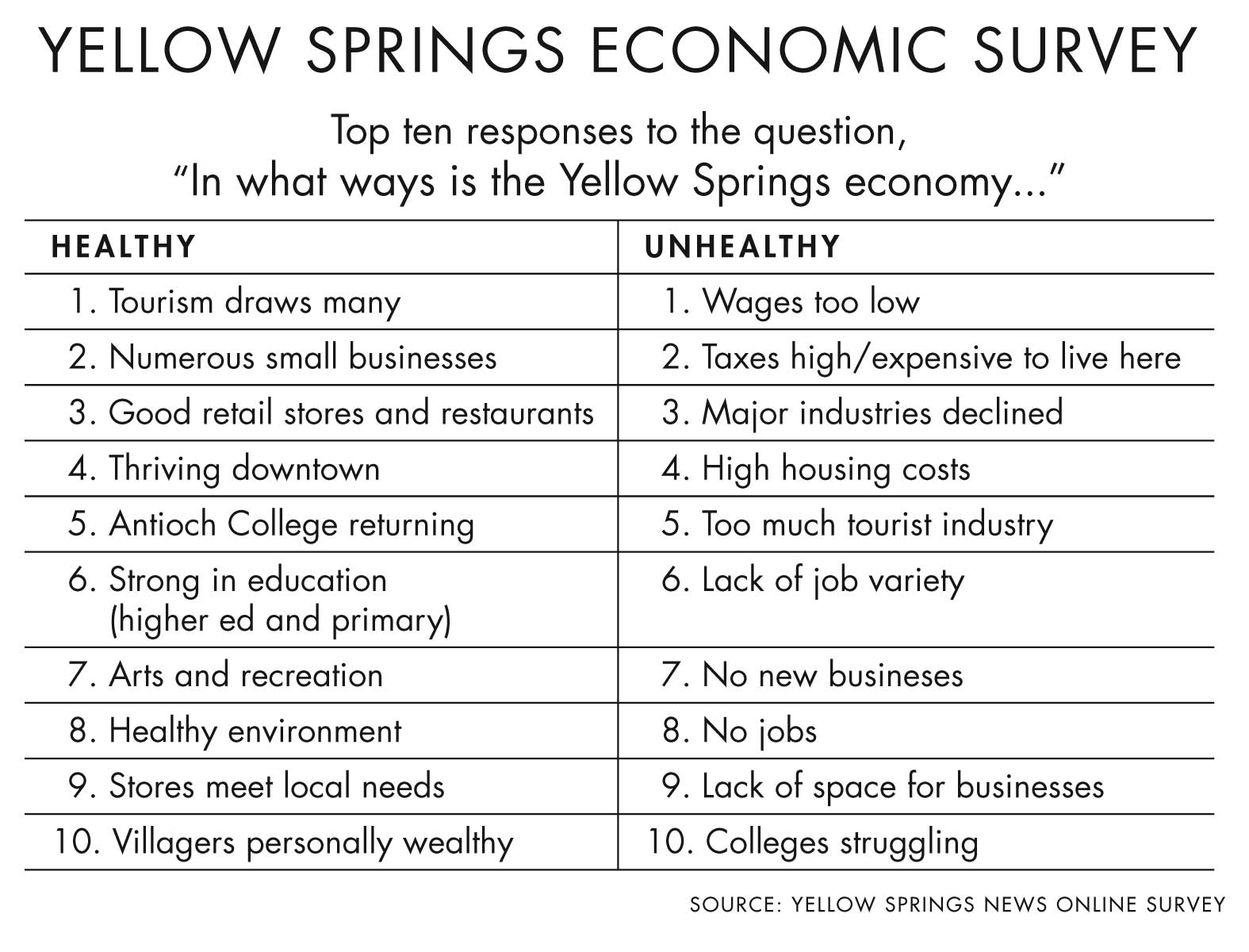 Survey respondents also identified the decline of large local industries over the last few decades, the paucity of new businesses coming or starting here, the lack of diversity in local jobs, an overreliance on tourism and a negative attitude toward businesses as ways that the Yellow Springs economy is unhealthy.