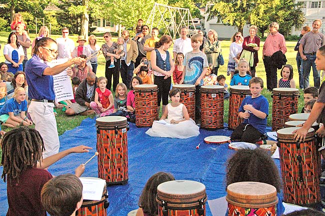 At last Friday’s exhibition of the school-wide Project Peace Initiative at Mills Lawn School, third-graders performed a conga drum performance, as part of D.R.U.M Code.
