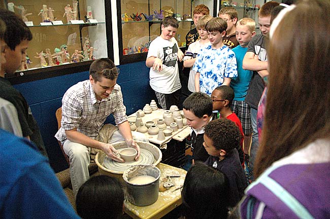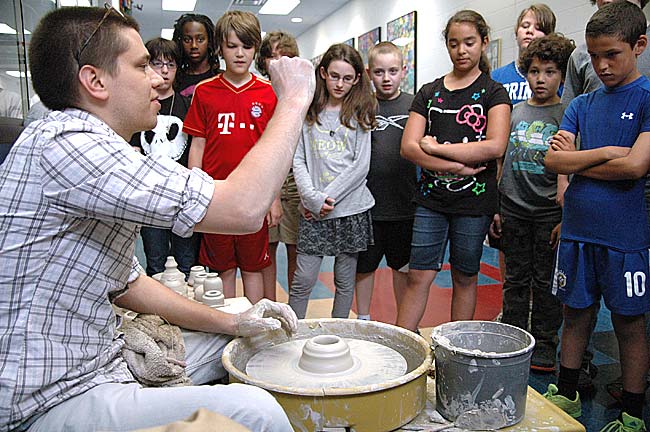 Local artist Geno Luketic visited Mills Lawn School Thursday, May 15 and demonstrated how to throw pots out of clay on an electric wheel.