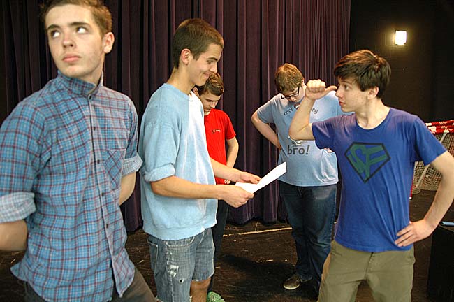 “My Brother’s Keeper,” a vignette about Cain and Abel including, from left, Blaze Wright, Sam Crawford, Jeremiah Scott, Bear Wright and Josh Seitz, is part of the Yellow Springs High School One Acts showing this weekend at Mills Lawn auditorium. Friday and Saturday shows start at 8 p.m, Sunday’s show is at 2 p.m. (Photo by Lauren Heaton)