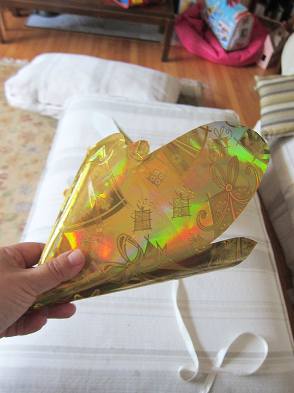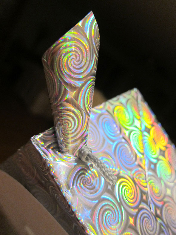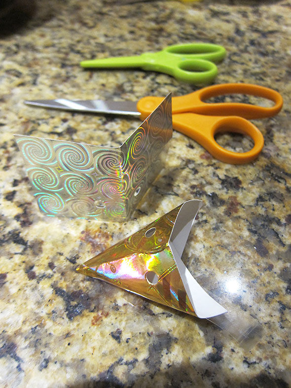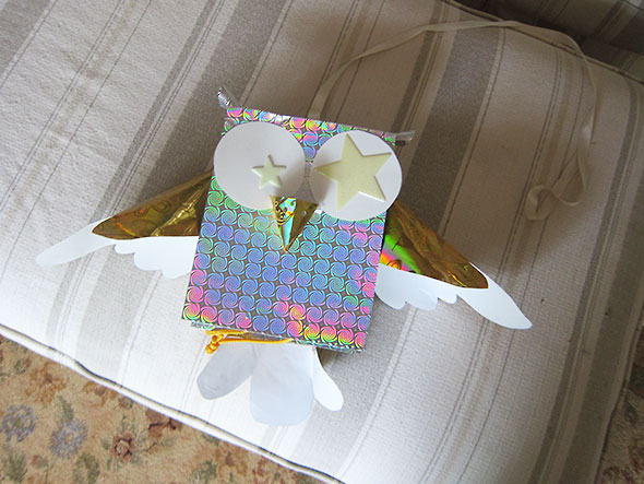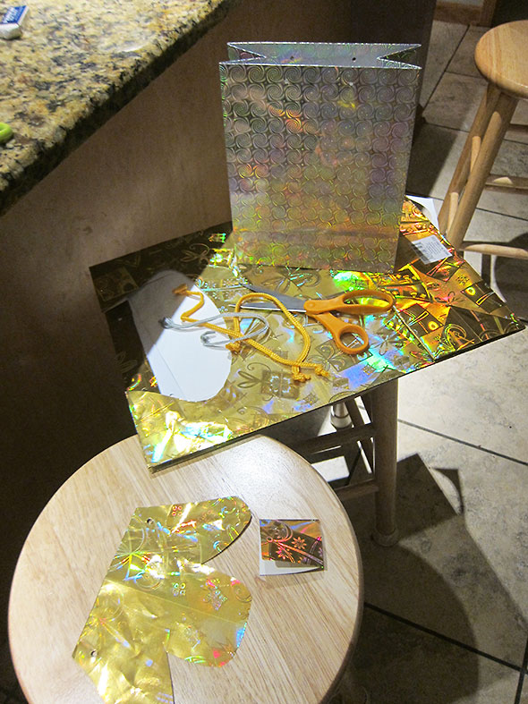 I was surprised to find nothing of that description. Large and white, small and purple, reindeer and Santa Clauses, baby carriages and balloons, but no small white gift bag. I thought of running to Current Cuisine for one of their take-out sandwich bags but, in putting back our stash of gift bags, I paused over a medium-sized silver bag with a repeating kaleidoscope-like pattern. I held it up for my daughter’s inspection, and her gasp told me that I had scored a great find. We paired the silver bag with a larger gold bag—from which we could cut the owl’s tall feathers and wings—and returned to the kitchen to work.