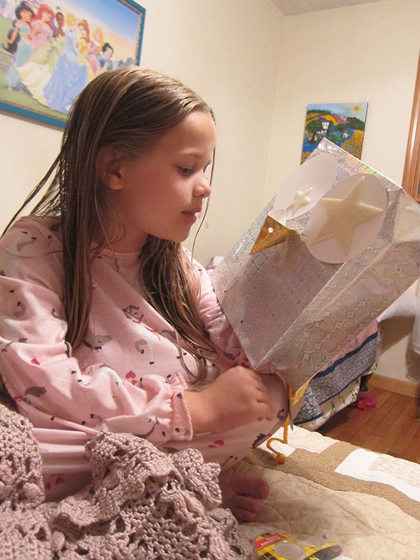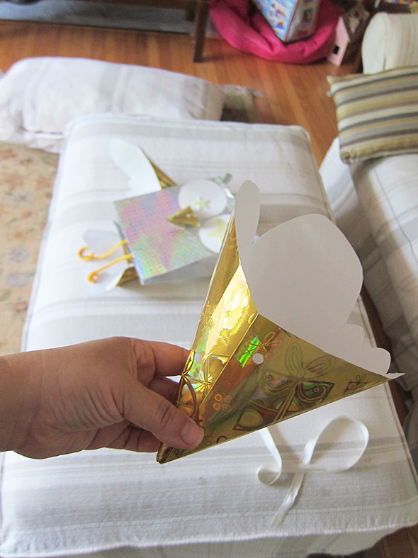 We cut out each wing with its straight edge along a fold keeping some of the overlap to reinforce the wing edge. We formed a cone-shaped wing and punctured its underside with a hole punch so that we could fasten the wing to the sides of the owl. We cut a small slit along the recessed fold of the silver gift bag to place the first wing and lined the hole with tape to strengthen the joint. The last silver cord threaded through the wing and the slit, and I tied a knot on both sides of the joined paper. We then cut a slit on the second side and threaded the silver cord through to attach the second wing. Finally my daughter produced a white silk ribbon for our owl to float on. We tied the ribbon to the cord that held the ear tufts on and threaded it out through a seam on the top of Hedwig’s head.