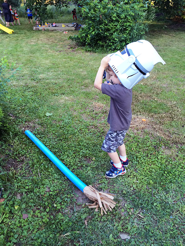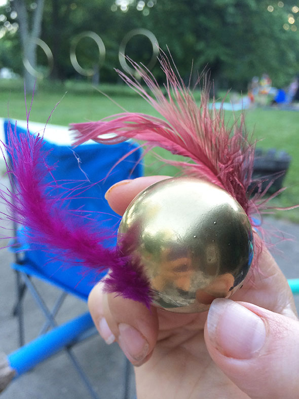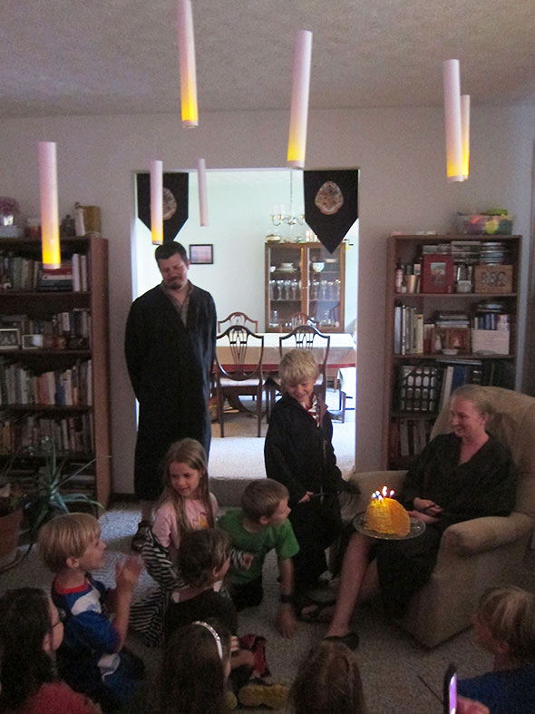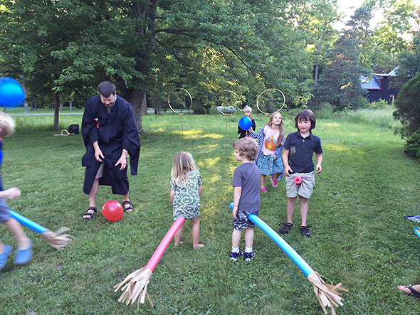 After a feast in the Great Hall, the school’s students had a potion lesson from Professor Snape and a rousing game of Quidditch refereed by Professor McGonagall. The students flew about the field on lightening-fast broomsticks, Firebolts for all, personalized for each enrolled student. A red balloon served as the Quaffle, and the students scored goals by tossing it through golden hoops on either side of the quidditch court. Each team had two Bludgers—blue balloons which temporarily froze players that the game balls touched. Each student got a chance to play Seeker in the game and seek out the elusive Snitch, a small golden ball with feathery wings that might zip here and there about the field and bestow a bounty of game points to the successful seeker.