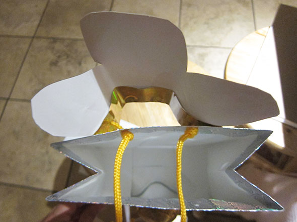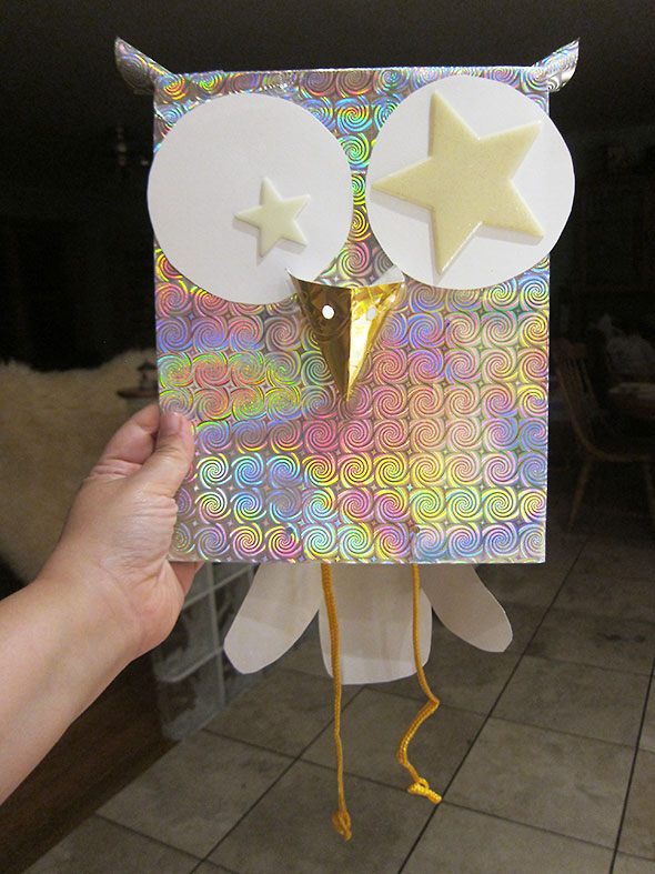 A planned formed to use about everything. We’d cut a set of wings and tail feathers from the gold bag and use its matching gift card for the owl’s beak. The cords could be used to hold the wings and tail in place. In phase one, we’d add a tail, beak, and eyes. In phase two, we’d add the wings.