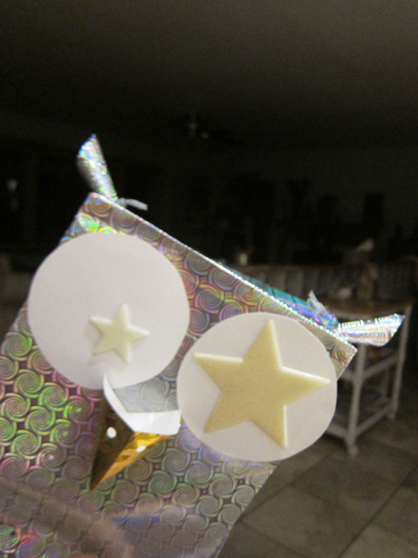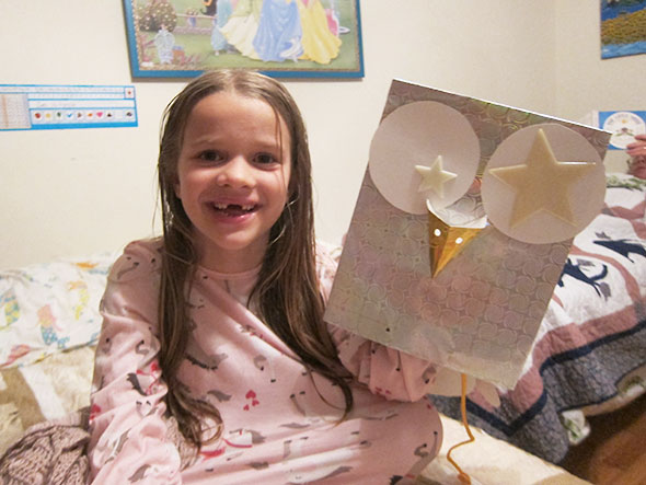 We cut out big white circles for the eyes, and my daughter attached them with double sided tape. She also found two glow-in-the-dark stars—mismatched in size—for the owl’s goggly eyes. We were pleased with phase one of our Hedwig, but her head looked rather square. To enhance her profile, we decided to make her ear tufts.