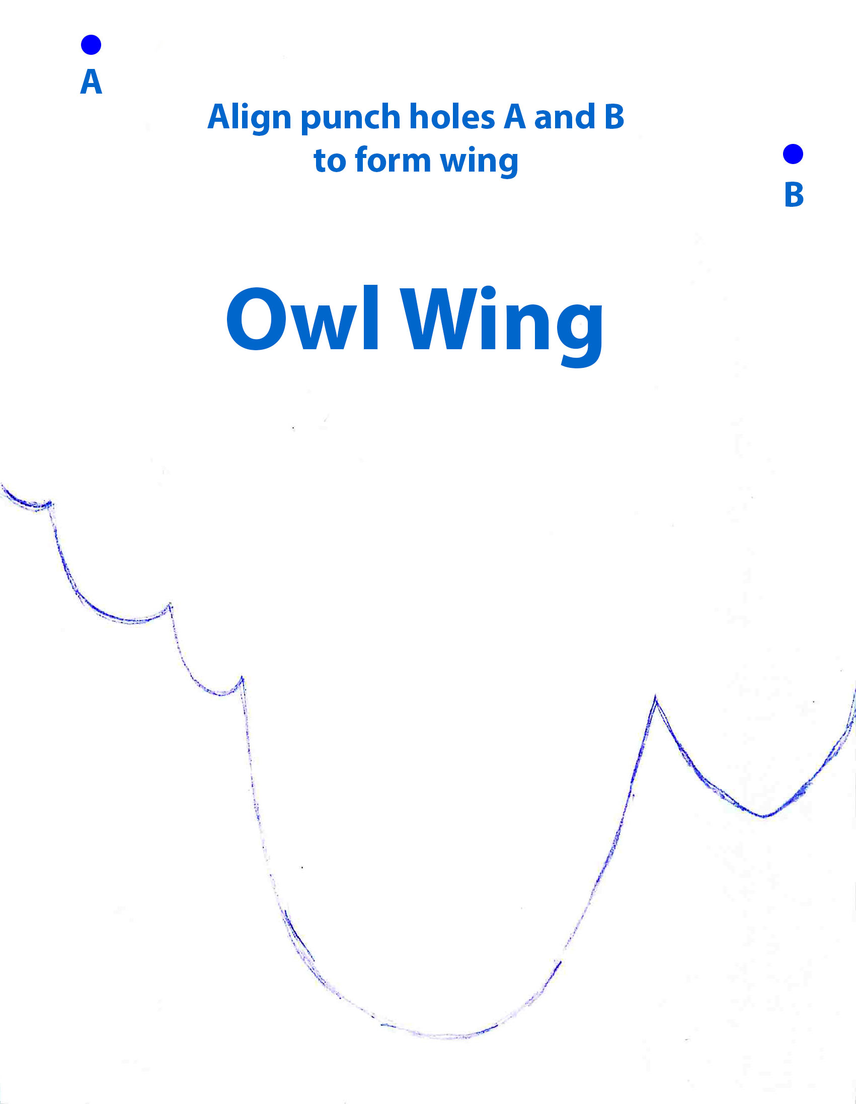 For our owl’s ear tufts, we picked up the silver gift card and cut it in two along its fold. Once again, we formed a cone with each half. However, unlike the beak, this time we made sure that the punch hole was at the pointy end of the cone instead of at its flare. We then attached one ear tuft to the top of the owl’s head by threading a silver cord through the tuft’s punch hole and then through a seam at a corner of the bag. To attach the second ear tuft, we threaded the cord back through the fold on an opposing corner and through the punch hole of the second tuft. In this way, we completed phase one of our owl. With only the wings remaining, we set our new friend aside for the night and dreamed of her nocturnal adventures.