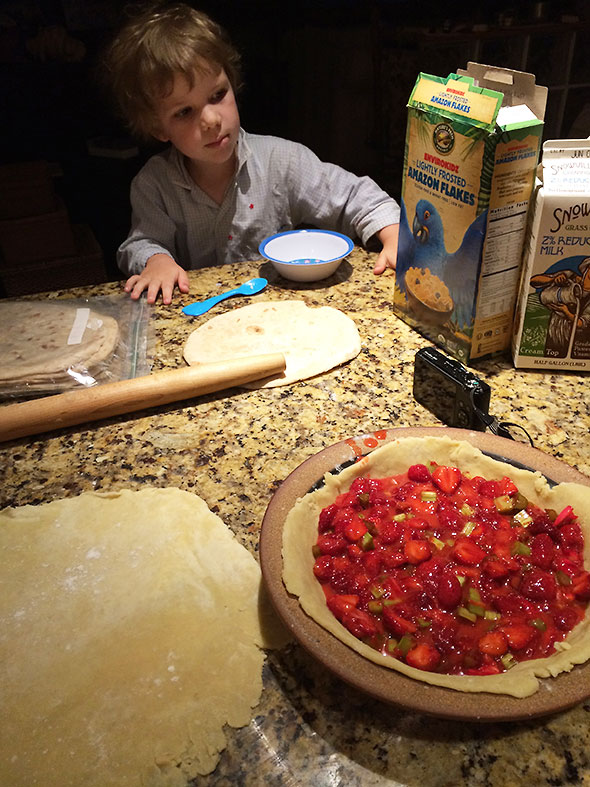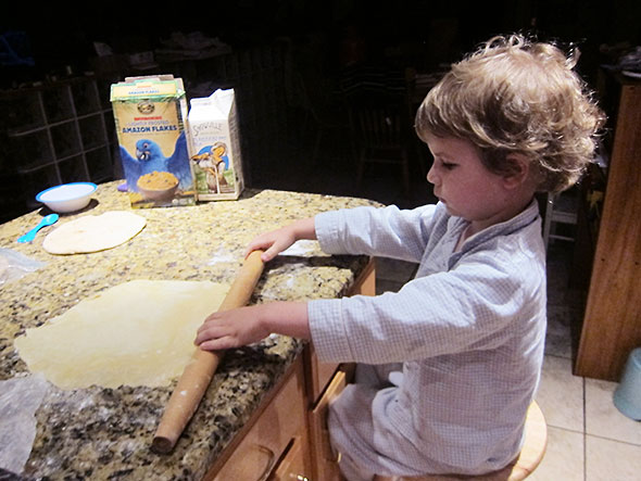After I filled his cereal bowl to satisfaction, he watched me roll the pie dough as he ate his frosted flakes. When he finished eating, he stepped down from his stool, wrapped his arm around the seat, and carried the stool around to set it at my hip. As he climbed up next to me, I asked “Would you like a turn?” and he nodded. He added a determined “Yes” with charming decisiveness and an almost imperceptible lisp. Pleased that I had caught on immediately to his intention, he picked up the narrow rolling pin and set to work confident in his form.
