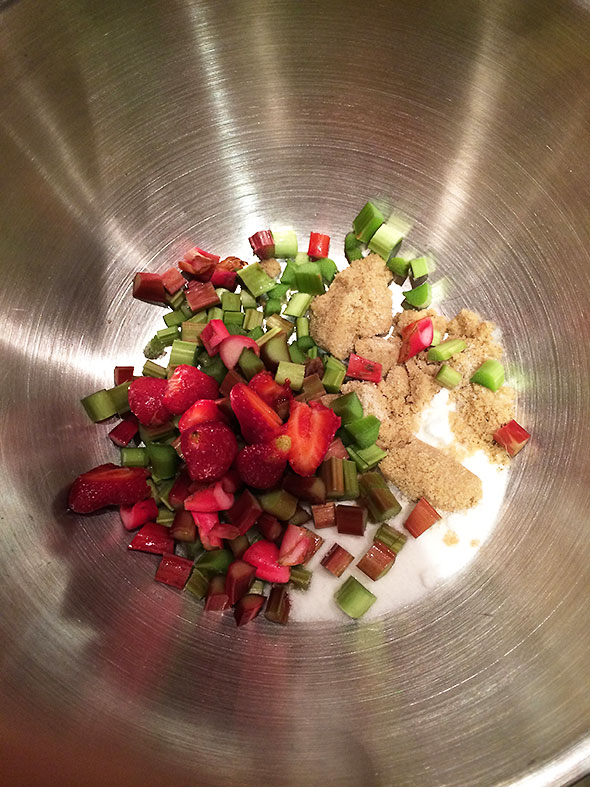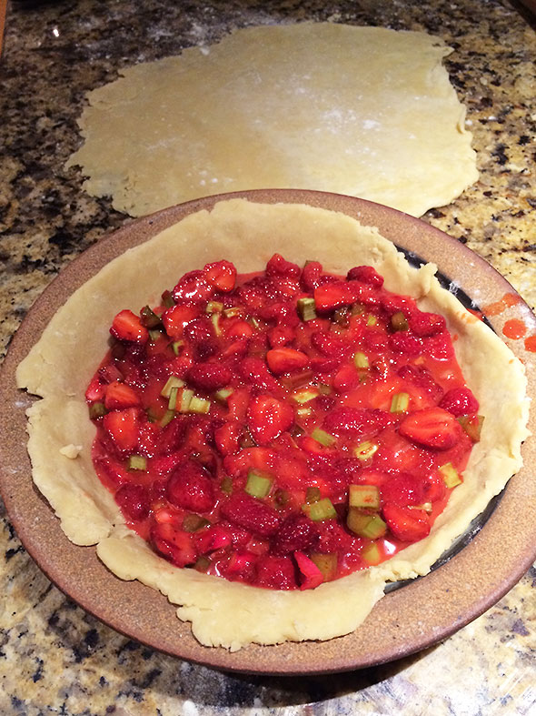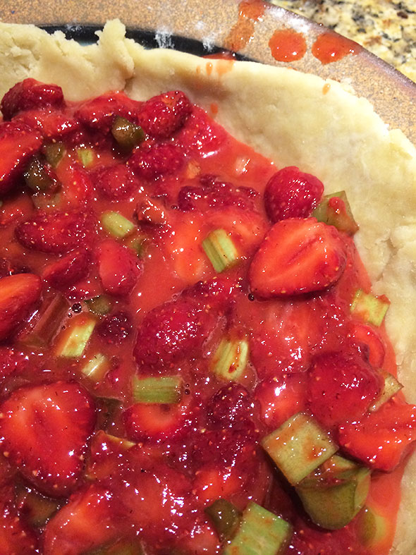 In the early hours of Wednesday, I could act finally and worked as if propelled. I had the pie dough ready. I also had two full hours of the cool pre-dawn morning to construct the pie’s layered architecture and bake it in a pipping hot oven. For the strawberry rhubarb filling, I consulted the internet—always awake—and settled quickly on a not-too-sweet composition engineered by Deb Perelman of the Smitten Kitchen. The porch light at Tom’s Market would be dim for another 2-3 hours, so I had to make do with the contents of my pantry. I had sugar—white and brown—and salt and even tapioca flour but no source of lemon juice. Not to be thwarted, I substituted orange juice for lemon and carried on.