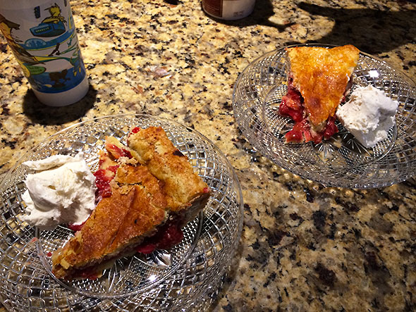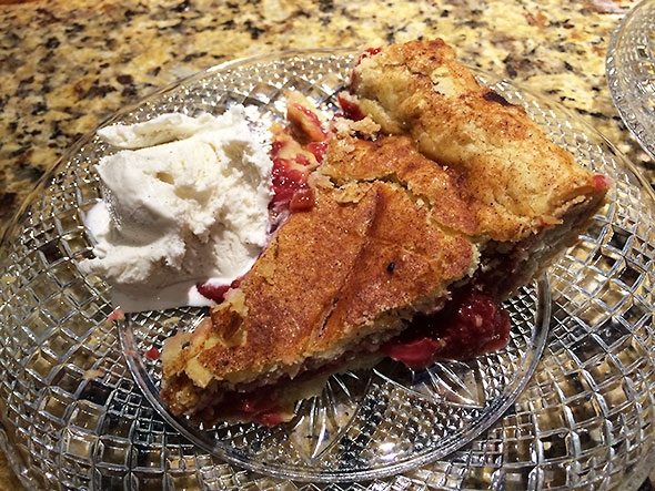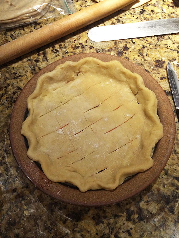 And the pie we made together? It was wonderful. Flaky crust sheared at the touch. The bright red interior set to proper consistency and cleaved cleanly into slices. The slightly overripe fruit brimmed with a zinging flavor that bounded off our scoops of vanilla ice cream. It was a pie born of friendship, persistence, and—I see now—no small amount of divine intervention.