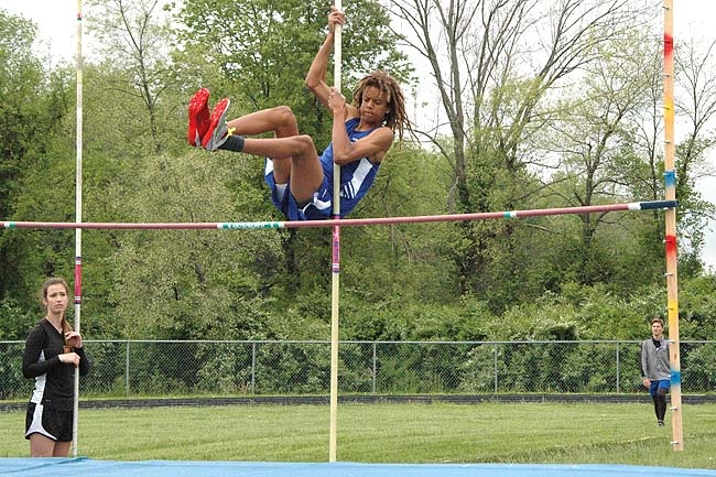YSHS track and field star Oluka Okia leaped over the pole vault bar during the Metro Buckeye Conference championships at Yellow Springs High School on May 17. Okia went on to win the conference title in the high jump (5’8’’) to help propel the YSHS boys team to a second-place finish. The girls team also came in second. The track season ended this week. (Photo by Megan Bachman)
