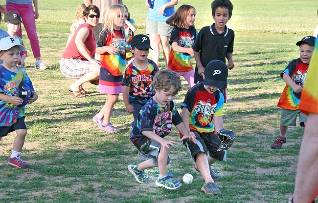 Peyton Crawford comes to the plate with his mom, Christy. He is small, as thin as a knife-edge. Then, as quick as a flash of lightning -— Slash! Bash! Boom! -— he hits the ball right into the 18-legged creature standing but 15 feet away, all those eager-beaver razz-ma-tazz t-ballers in the center of the diamond, one group on their knees, running their hands over and through the dust, stirring it, piling it up, flipping it in the air in front of themselves; another group facing us at the plate, hungry, nearly delirious for a ball.