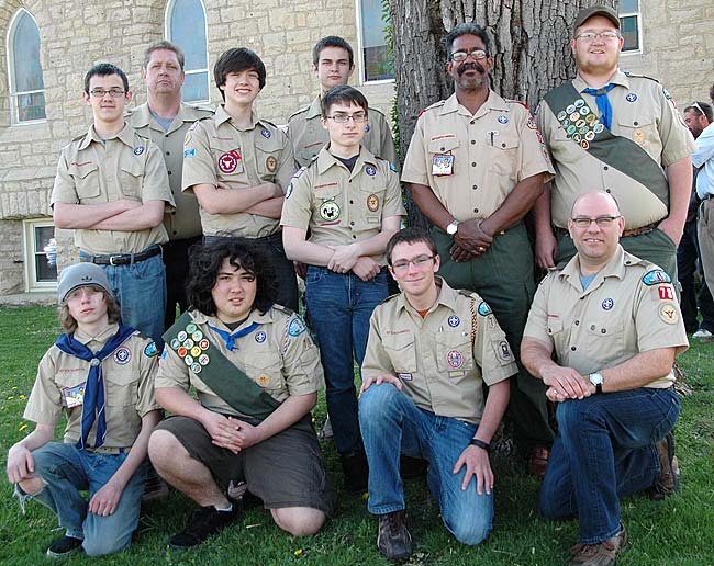 The local Boy Scout Troop 78 celebrated its 75th anniversary last week with a potluck at John Bryan day lodge for current and former scouts. Pictured in front of the First Presbyterian Church where the troop meets each month are current officers and scout masters, including, back row, from left, Andrew Kraus, Paul Evans, Nathan Hardman, Alex Kraus, Thomas Cunningham, Brian Upchurch and William Evans. In front from left are William Gray, Weymar Osborne, Lake Miller and Mike Miller. (photo by Lauren Heaton)