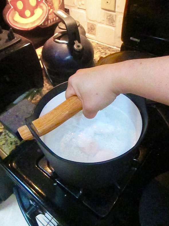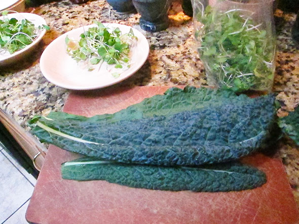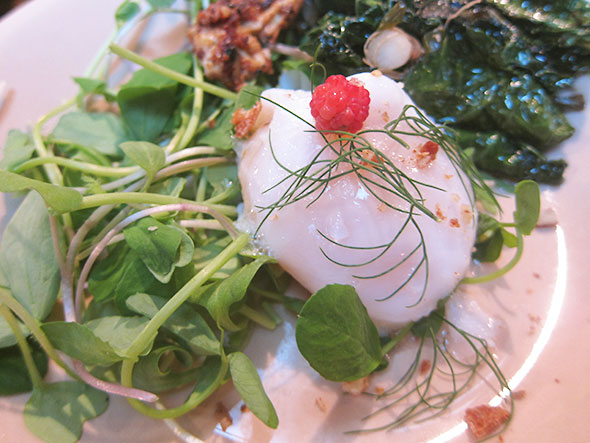 The morning’s bounty made me uncommonly ambitious. I started to prepare three items at once: poached eggs, stir fried kale, and fried zucchini blossoms. I cracked three duck eggs and siphoned off a portion of egg white to coat the zucchini blossoms. After slipping in the egg yokes into the heated water, I spun the pot to keep the eggs from attaching to the enamel bottom. Then, I heated a second pan—a large iron skillet—and began stir fry of onion. As the onion cooked down in olive oil, I prepared two bowls: one with a tablespoon of yogurt and a second with crushed potato chips and pecans. I spun the pot of the eggs once more—testing their doneness—then added kale to the onions. Satisfied with the eggs, I spooned them out of the hot water to cool on a plate of raw pea greens.