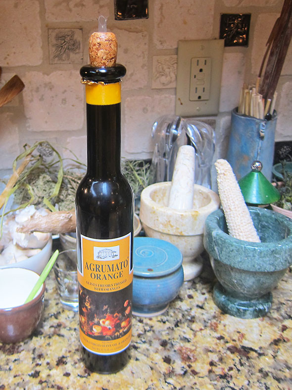 During the winter, I purchased a bottle of agrumato from the Winds Wine Cellar. The bottle sat many months before I braved opening its seal. It has an exotic profile: tall, balanced, but almost impossibly slender. The heavy dark glass conceals a bright oil pressed from whole oranges and late harvest olives.