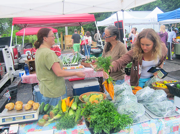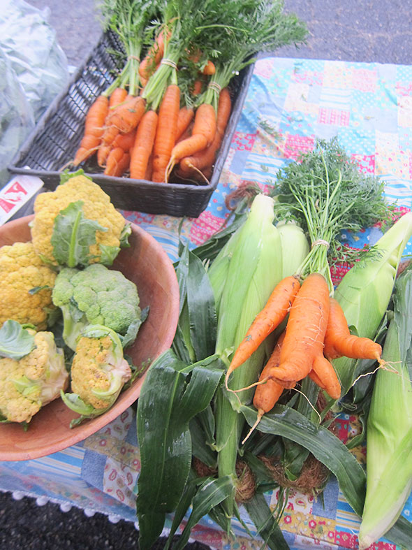 The immediate objects of my desire were kale and sweet corn. I moved directly from the parking lot—umbrella in one hand, checkbook in the other—to Flying Mouse Farm‘s vending table. The morning rain had tapered off and with it my reasonable hope of success. Michelle Burns of Flying Mouse had announced Thursday that they would have sweet corn but how much they would only find out when they got to the field in the morning. I found Michelle at the King’s Yard market surrounded with fresh pickings of corn, beets potato, onion, carrots, and kale. I only had eyes for the sweet corn. In line before the bin, I stood a pace back and waited with some anxiety behind a woman who was gingerly sifting through her collections of market bags looking for—could I wish?—a small sack and not a large one. I was trying hard to keep myself from counting the remaining ears when, to my near fainting relief, Michelle restocked the bin with a few dozen ears.