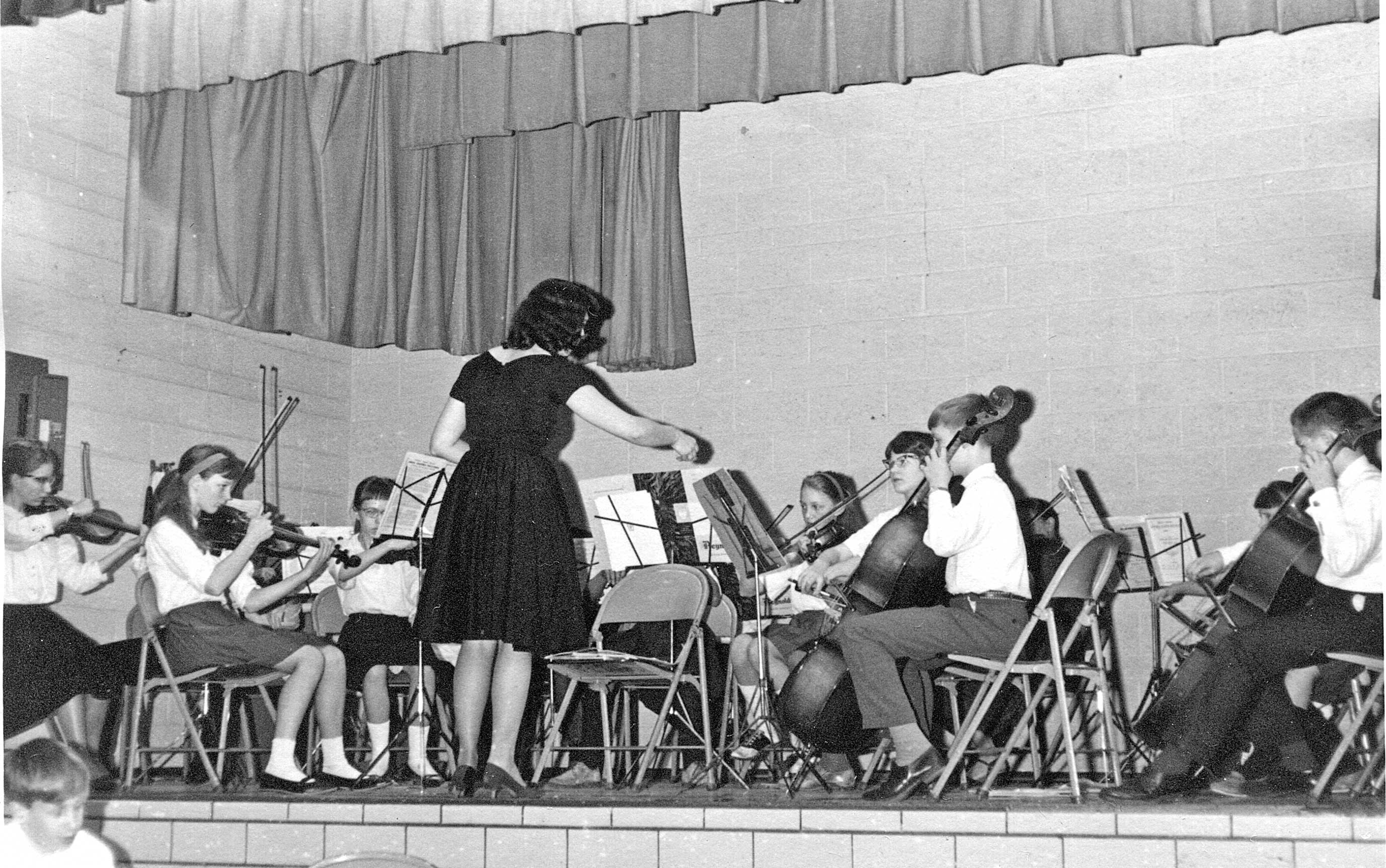 “At the high school the orchestra was always a part-time program, but I was determined that the kids would have a full-time experience,” she said. So between raising a family and performing as a cellist in her own professional ensemble, the English Trio, Mullins grew a star-studded orchestra program with many students who went on to music careers. She took the groups to orchestra contests each year, mostly competing in class B for small schools and typically receiving the highest ratings. And in the 1990s, the music program extended down into Mills Lawn, to start students early on both band and string instruments.