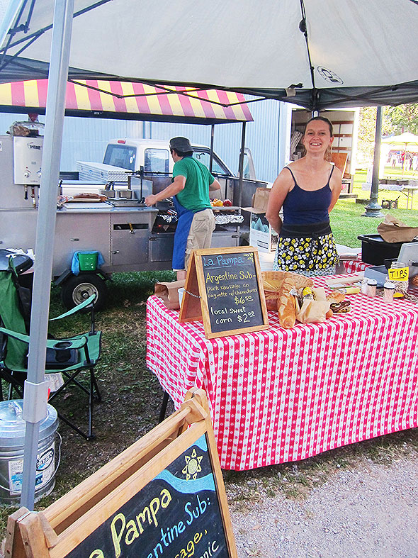 We were back at the festival within the hour following our noses to our evening meal. We hit gold right away. Next to the music pavilion at the center of the festival, we found Mariano and Luisa Rios of La Pampa Grill caramelizing bright orange and yellow peppers, pork sausage, and corn on the cob. We ordered an ear of corn for each family member and a sandwich for the adults.