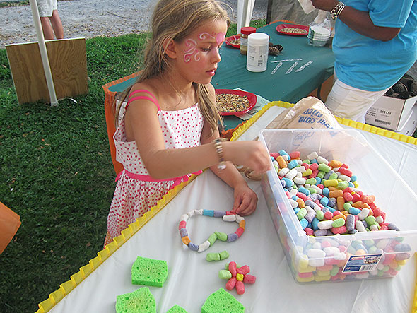 After dinner and a scoop of vanilla from the Clifton School House ice cream social, my daughter enjoyed an evening of invention at the children’s craft table. Her face painted with a central heart and wistful swirls of pink and white, she made a bird feeder from a pinecone, seeds, and peanut butter then a heart-shaped trivet from multicolor packing noodles that stick together when damp.