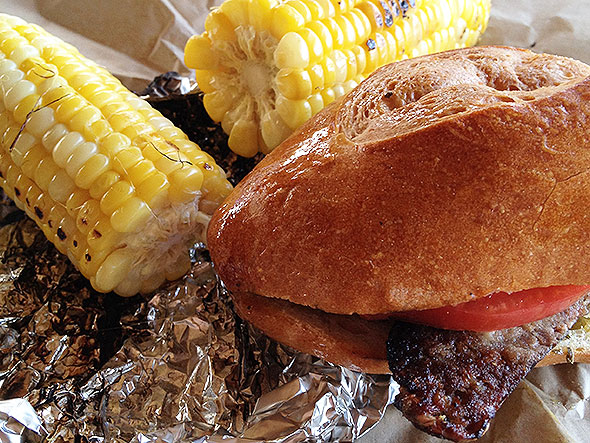 I lured the kids out of the bouncy house to the picnic tables of the music pavilion with piping hot cobs of buttered corn. To my surprise, they pounced on the pork sausage sandwich first. Pulling apart the sandwich into its elements, they ate the peppery chorizo sausage and the crusty, local-baked bread sopped with chimichurri sauce. They consumed my sandwich in its entirety, and I had cued up again to taste one for myself.
