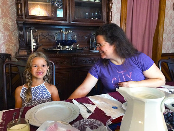 While in New York, our daughter dedicated herself to living up to the name of the bed and breakfast where we spent our first night, The Elegant Lady. After a breakfast of eggs, sausage, local cantaloupe, and a cobbler of blackberries collected from the B&B back lot, our daughter remained rapt following the proprietor Barbara Koehn through the tour of the beautiful Queen Anne home. Barb detailed the restoration work that she performed—the cherry and walnut woodwork, the ornamental plaster molding, the collection of the antique furnishing. Together, proprietor and guest lingered over the vintage prints of victorian ladies. They discussed the history of the 1890’s home, its escape from the worst of the 2009 flood, and the lives of the first residents.