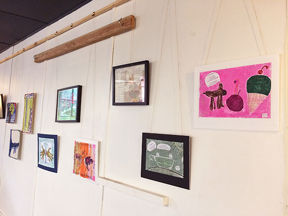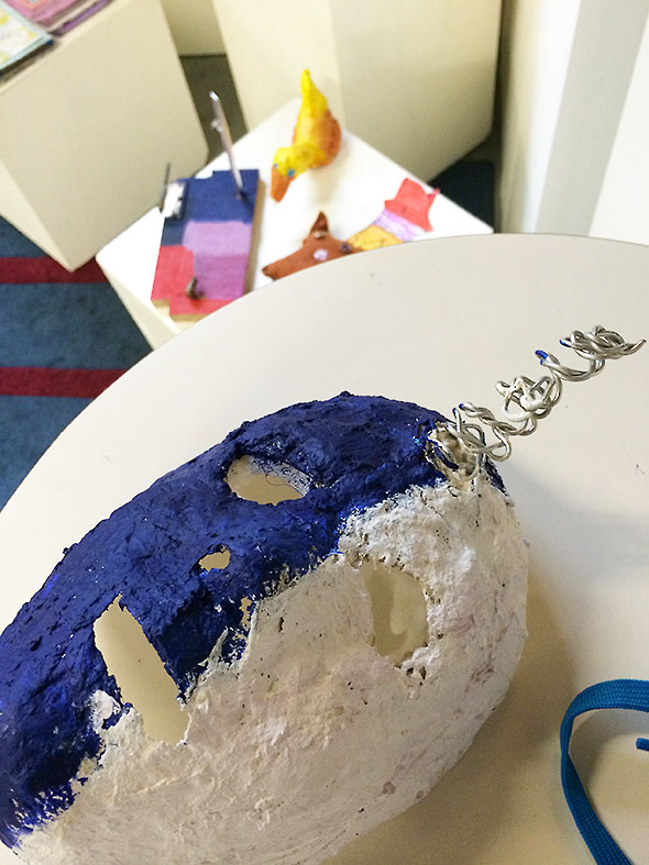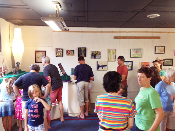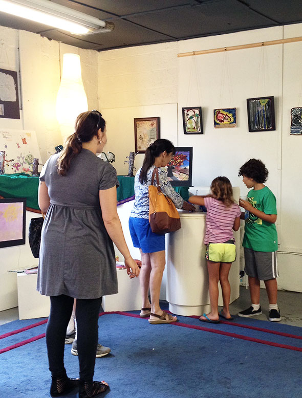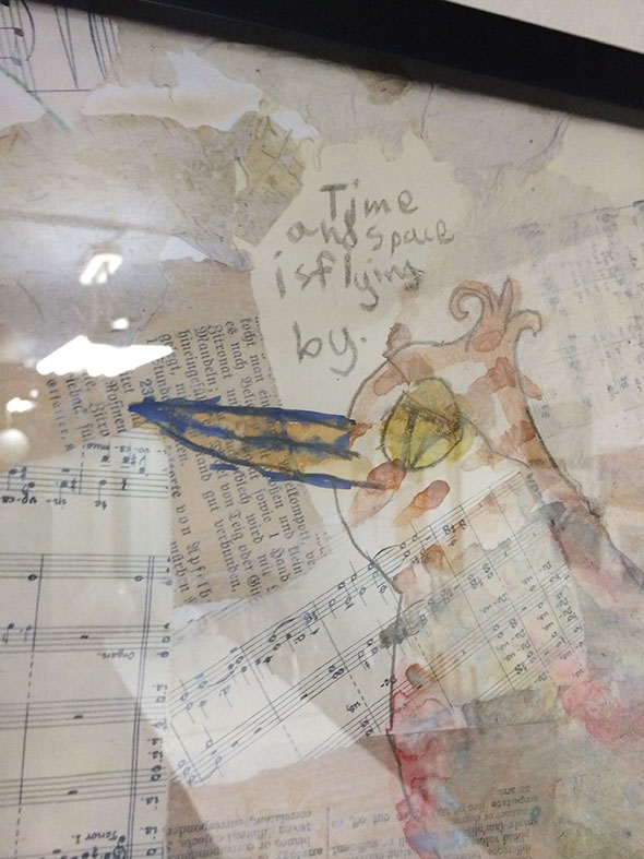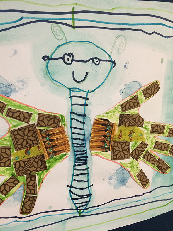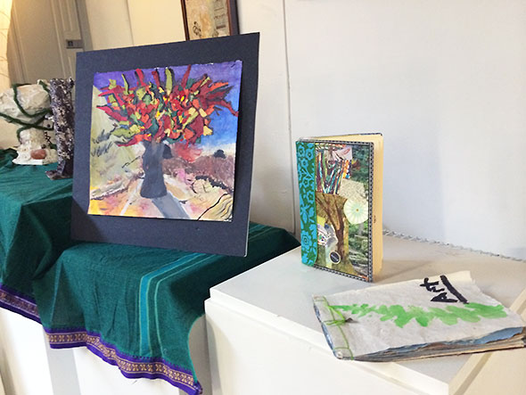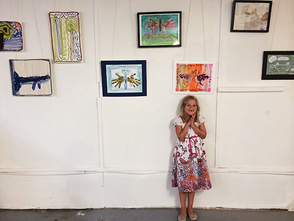 Mastering a construction set is one small step in creative play. While our son developed dexterity and spacial relations, our daughter developed her skills in multimedia art with Sarah Strong of Strong Heart Press & Studio. We’ve enjoyed the projects that our daughter brought home from the studio, but just last weekend we got the opportunity to deepen our appreciation. The Yellow Springs Art Council, 111 Corry Street, is hosting Explorations in Creation!—a show of the studio’s after school and art camp projects—until 10 August. Our family attended the opening Sunday afternoon and witnessed the great scale of accomplishment within the class. The range of expression and texture present in the displayed works is enchanting enough but the degrees of mastery among the students—all very young—is striking. An interesting vocabulary is developed in each piece layered like a well-prepared dish with both crunch and creaminess. The studio’s students accomplish so much because they search along multiple paths in a single piece. Sarah Strong doesn’t teach her students how to do something; she teaches them how to mine their own natural intricacies and gain passage. The assembly of pieces sing in harmony and though their resonances I see that a student’s compelling work is no happy accident but the attainment of a master builder.