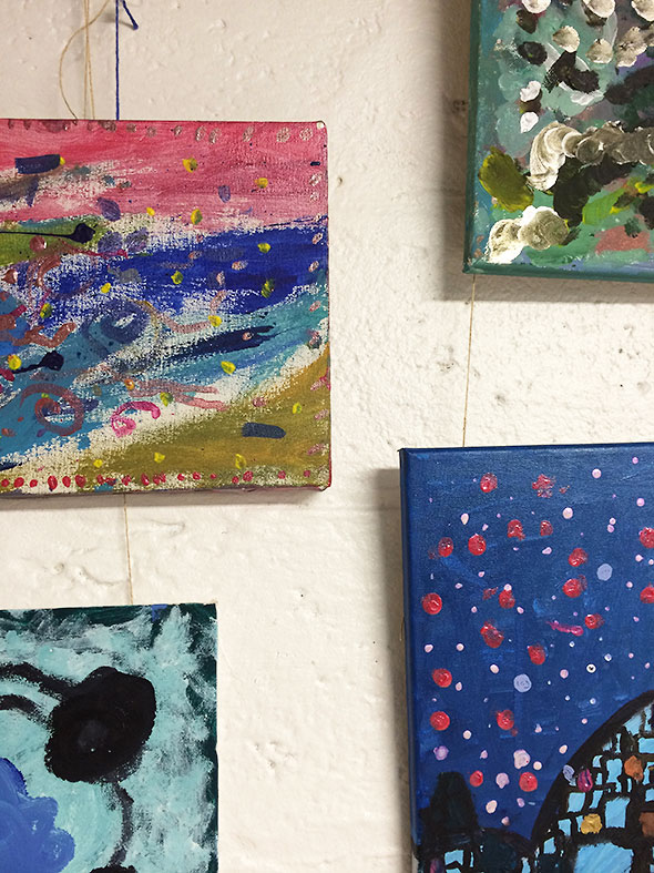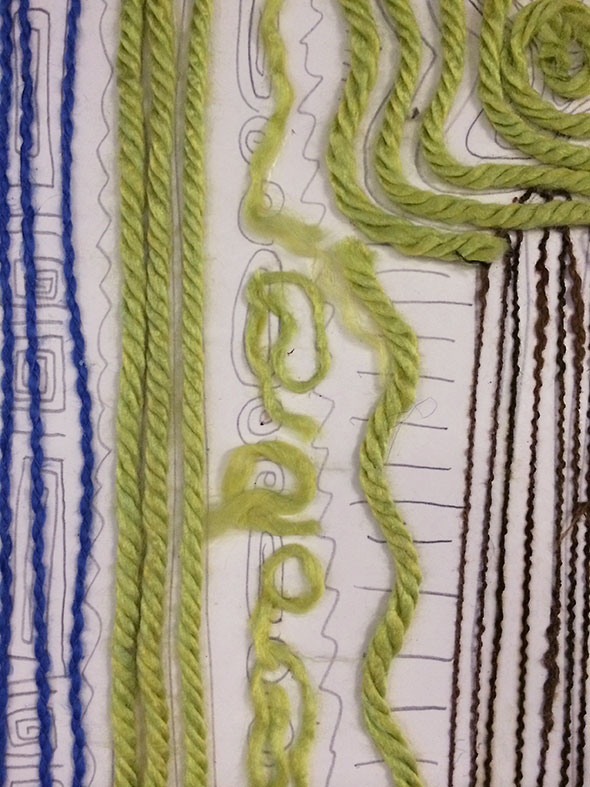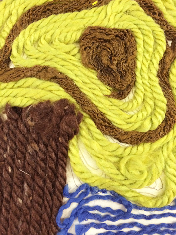 At the Strong Heart art show, I can catch views into a multi-hour lesson as distilled in two or more interpretations. Every point is a sign of progression but one that intersects more than a single narrow skill. Like reunited friends, once-abstract paintings speak clearly…perhaps of the precocious relations formed between dots and lines…and carry on conversations with regard to organic subjects matter and evocative memories. I can trace the measure between ambition and ability in the layered ink and yarn pictures. The intricacies of the ink patterns approximated in the coarser yarn provides an extra tension to each picture.