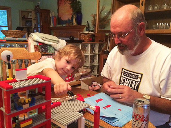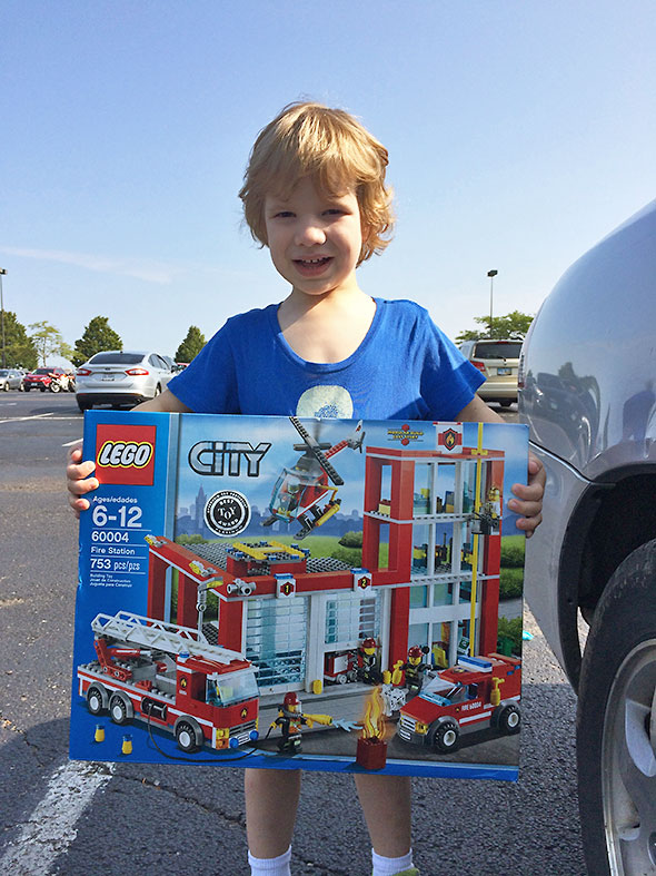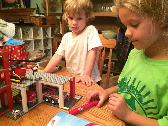 When my husband made this week’s purchase, he took as given that he’d never see all 756 pieces in one place again. The fire station lego set—two trucks, a helicopter, and a three story fire house—was an ambitious leap even after the 208-piece fire truck that he successfully assembled last week with our son. Grandpa Tom and Grandma Sue were coming for a 3-day visit however, and the time was ripe for a large scale project. With six of us keen to contribute, we could handle the pace of 252-pieces-per-day in stride.